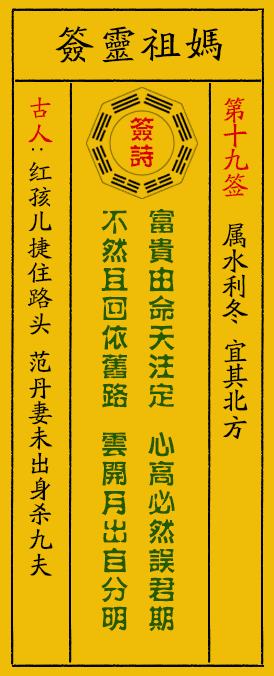 【台湾北海观音明善堂】富贵由天注定。所谓:“生死有命,富贵在天。”一个人的穷通祸福,姻缘富贵贫贱,都是上天安排,命中注定的,所谓:命里有时终须有,命里无时莫强求。此签暗示你的福份不足,不要期望太高,勉强进取必定会大失所望,而且会误了佳期。既然新路走不通,何不回头旧时路,说不定还能云开月出,见到光明前途。成功者并不一定都要开创新路,求神指引或问问前人走过的旧路,一样会成功的。求得此签暗示目前福报不够。问事求谋,只宜安分守旧。不可意气勉强。问事业,创新不吉,守旧安泰。问求财,不多,财多则身弱,反为不吉。功名难得,婚姻平平。移居出外,均不吉。问疾病,危险有阴邪元辰暗淡,宜消灾。 【台湾育德妈祖同修会】俗云:“生死由命,富贵在天。”一个人的穷通祸福、富贵贫贱,都是上天安排、命里注定的,所谓“命里有时终须有,命里无时莫强求。”如果你期望太高,必定会失望,而且耽误了你的佳期。既然新路走不通,何不回头走走旧路,说不定还能云开月出,见到光明的前途哩!一个人,当然须要有开创局面的雄心,但野心太大,超过了本身的能力,只想大喜功,反会招致失败的。还有“谋事在人,成事在天。”同样的才能,同样的努力,并一定就有同样的成功,这里面,当然有“命”“运”的因素在作祟,所以,明理的人不要太奢求!“条条道路通罗马。”成功并不一定都要开创新路,前人走过的旧路,有时你也可以跟着上去,一样会成功的!此签问事业,创新不吉,守旧安泰。问求财,不多,若财多则身弱,反为不吉。功名难得,婚姻平平。移居出外,移不吉。 |