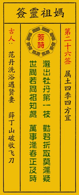 【台湾北海观音明善堂】大好时机,不要再犹豫不决了,诗云:有花堪折直须折,莫待无花空折枝。已经是上天评选出的第一枝牡丹花,劝你不要迟疑,快把握住机会。如果想要寻世间知音何在。不须再探究过去未来,一切以及时行乐为先,勿再浪费春光,等春去花凋落,切莫错失枉怨叹。这是一首告诉当事人及时行乐的签诗。有人说:制造机会的人,才是第一流的人才,而把握机会的人,是第二流的人才,丧失机会的人,是不入流的人材,希望你求得此签暗示时,快把握机会。求得此签暗示目前福报圆满,问事求谋可期,应及时把握良机。问求财,有财运,但须把握机会。出外,移居,动则有利。营谋做事,要积极主动,不可犹豫不决。问婚姻,天赐良缘,婚姻可成。问疾病,男无妨女危险求神渐渐痊愈。 【台湾育德妈祖同修会】诗云:“有花堪折直须折,莫待无花空折枝。”已经评选出来的第一枝牡丹花,美丽动人,劝你不要迟疑,快把握机会折取下来。如果寻问世间知音在何处,大地逢春是时机!一切行乐须及时,莫待春去空惆怅!这是一首比喻的签诗,告诉当事人莫错过了时机。有人说“制造机会的人,是第一流人才;把握机会的人,是第二流人才;丧失机会的人,是不入流的人才!”希望你抽到此签时,快把握机会,最少也得做到第二流的人才,不要把机会错失,成了不入流的人才。此签问求财,财运有,但须把握,以免错过发财机会。出外、移居,动则均有利,营谋做事,要积极主动,不可犹豫不决。问婚姻,天赐良缘,莫迟疑,婚姻可成。 |