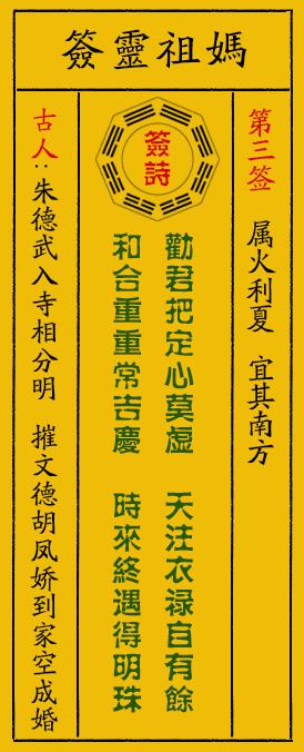 解曰 | 讨海:晚有大利。 作塭:和者必获厚利。 鱼苗:后得大利。 求财:后遇贵人大兴。 耕作:下冬好。 经商:先利平后大财。 月令:渐得春风。 六甲:先男后女。 婚姻:大吉。 家运:和气后得祥瑞。 失物:月光必在。 寻人:得回。 远信:守候佳音。 六畜:可纳。 筑室:大吉。 移居:后吉。 坟墓:永裕后昆。 出外:向南方遇贵人。 行舟:渐得大财。 凡事:吉。 治病:命不畏平安。 作事:必成。 功名:科甲连登尾有。 官事:不畏破财完局。 家事:余庆且喜。 求儿:吉。 |