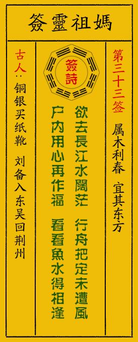 解曰 | 讨海:得财。 作塭:渐渐得财。 鱼苗:好。 求财:先微后有。 耕作:有收成。 经商:安分待时。 月令:不安。 六甲:先男后女。 婚姻:大吉。 家运:门庭兴旺。 失物:晚者用心再寻。 寻人:未日在。 远信:音信迟延。 六畜:小吉。 筑室:要把定待后日。 移居:二次成吉。 坟墓:地运小吉。 出外:平安。 行舟:恐防末日风波。 凡事:不可急进。 治病:拖尾破财不畏。 作事:二次成功。 功名:望后科。 官事:先呆后好。 家事:门庭缺后团圆。 求儿:且慢后日。 |