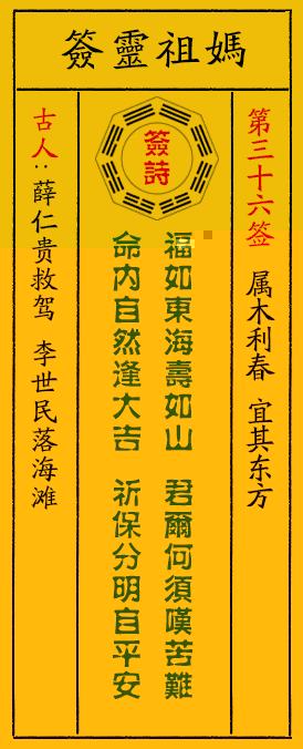 【台湾北海观音明善堂】你命中注定福禄像东海那么大,寿命像南山那么高,像这样福寿双全的命,还有什么苦难可言。既然命里己有,自然大吉大利,只要祈求神明保佑,就会获得快乐平安。这是一首很幸运的签诗,表示福寿双全,就应该满足,就勿再自寻烦恼了。求得此签除功名福禄寿俱全外,还有随遇而安的意思。问求财,大利。婚姻,圆满。问诉讼,表示无事。如问事业,外出经商,必须慎重考虑。乃此签告之,要“知足常乐”,不须去自找苦吃。问疾病,宜消灾。病情加重,老人危险宜消灾。 【台湾育德妈祖同修会】你的福禄像东海那么大,你的寿命像南山那么高,有这样福寿双全的命,还叹啥么苦难呢!既然命里已有,自然大吉大利,只要祈祷,就获得平安!这是一首很幸运的签诗。表示福寿都有,就该知足,此谓“知足常乐”,如果你还有烦恼,就是自寻的了!此签除了表示功名福禄寿全外,如问诉讼,表示得意,如问生病,可以痊愈,如系问创新事业,或出外经营,则有考虑的必要。因为全签的意思,要你知足常乐,不必再去自找劳苦。曾有某一退休人员,家境富裕,但因无工作不好好打发时间,乃与友人合伙经营餐厅,事前抽得此签,以其吉签而未多考虑。后来被合伙人骗去巨款,后悔莫及。 |