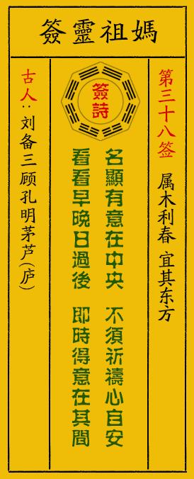 【台湾北海观音明善堂】不须太过执着目前的处境。只要坚定自己心中的目标,光明正大不偏不倚,名位自然显达圆满。不须要向神祈求,心里自然安祥。只要看看那早晚太阳的升沉,就会领悟到天地循环的道理,才能即时得意在其间。此签,乃告诉我们做人处世不宜太偏激执着,日有阴晴圆缺人有旦夕祸福,无须为一时的不如意太过在意。应采取乐观进取的态度,坚持目标循序渐进,常以失为得,自然能悠闲自得不会患得患失。求得此签暗示目前福报平平,问事求谋,需按部就班,不可冒进而增加无谓的困扰。问求财,宜守旧,不可贪求。心存正直。自然无忧。问谋事,虽有成功的希望,但时间上恐会拖延。谈婚姻,较迟。问诉讼,则以和解为宜。问疾病,未安,宜求神消灾解厄痊愈。 【台湾育德妈祖同修会】坚守中正立场,不偏不倚,名位自然显。不须向神祈求,心里自然安祥。看看那早晚太阳的升沉,就会领悟到,惟有坚守中间立场,才能即使得意起来。此签原意,乃告诉当事人,处世做人不宜太偏激,应该采取中庸的态度,这样,才能获得心安理得,人家也自然会敬重起你来。抽到此签,问求财,宜守旧,不可贪求。心中存着正直,自然无忧。问谋事,虽有成功的希望,但时间上恐久延。谈婚姻,在时间上为宜。问疾病,目前还无法痊愈,尚须待一段时间。友人张君,报名参加高考,不知能否高中,乃赴妈祖庙抽得此签。后高中金榜,分发经济部服务。经济部属中央级机关,正应了“名显有意在中央”句,真妙哉! |