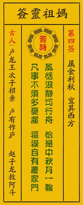 【台湾北海观音明善堂】风平浪静,船行无碍,就像中秋明月,圆满皎洁。凡事不必多忧虑牵挂,福禄自有也不须外求,等时来运转,自然喜庆满门。这是一首很幸运的签,表示一切能顺利如意,圆满达成。求得此签暗示目前福报稍有不足,问事求谋难成,机缘未到时易忧心烦恼,如果是应考之人,是金榜题名的好兆头。这首签诗除了表示功名有望,福禄齐全外,如问诉讼,表示要走的正。如问婚姻,表示和谐美满。如问移居,一切顺利安康。问疾病,祈神消灾近日痊愈。 【台湾育德妈祖同修会】风平浪静,船行一帆风顺,正像中秋明月,圆满皎洁。凡事不必多忧虑,福禄自有不必求,时来运转,自然喜庆满门。这是一首很幸运的签诗,表示一切顺调如意,圆满达成。如果是一位应考的人,抽得此签,是金榜题名的好兆。这首签诗除了表示功名有望。福禄全。如诉讼,表示得直。如问疾病,可以痊愈。如问婚姻,表示美满。如问移居,一切安好。 |