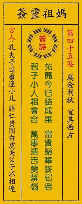 【台湾北海观音明善堂】你的造化真好,正像盛开的花朵,现在已结成果实,是收获的季节了,相信你到老都可以享受到荣华富贵。只要你待人真诚,君子小人都会喜欢和你交往相互帮忙,万事自然清吉顺利,不必多烦恼。求得此签暗示目前福报圆满,问事求谋有望,有神缘会得神明暗助,过去的努力终于有成果了,现在你可以尝到甜的果实了。此签问求财,要看你过去勤劳的程度,过去越勤劳,现在获利越多。问功名,也是一样,看你用功的程度如何而决定成就。问婚姻,美好幸福的姻缘,婚谈可成。问疾病,求神自安,医遇贵人,老人则拖尾危险。 【台湾育德妈祖同修会】你的运气真好,正像盛开的花朵,现在已成果实,是收获的季节了,相信你到老都可以享受到荣华富贵。只要你待人真诚,君子小人你都可以跟他会合,万事清吉顺利,不必烦恼。此签告诉当事人,过去的努力终于有成果了。一分耕耘,一分收获。过去虽很辛苦,但现在你可以尝到甜美的果实了。此签问求财,要看你过去勤劳的程度,过去越动劳,目前获利越多。如果过去不肯多费功夫,目前就没有财利可言。问功名,也是一样,看你用功的程度,而定你的成就。问婚姻,和好幸福的姻缘,婚谈可成。 |