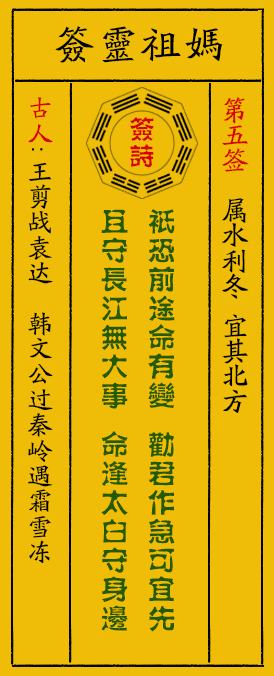 【台湾北海观音明善堂】尽管前途多有变故,劝你莫心情焦虑。既然不得先机,就暂时守在长江头,命里自有太白金星等神明保佑,自然不会有什么大事情发生。这首签诗暗示做事须有先见之明,不可燥进鲁莽行事,以免造成不必要的变化。并且多拜神增福来获得神明的庇护。求得此签暗示目前福报不佳,问事求谋不宜急进,所谓欲速则不达,且须等待时机。问婚姻,对方可能有意中人,成功希望不大。问诉讼,和解为宜。问功名,有希望。求财平平。事业宜按步就班,不可好高骛远。问迁移或变动职位,不吉。总之,不妄动,求神化解自保安泰。问疾病,宜消灾。地有阴邪,男无妨女危险。 【台湾育德妈祖同修会】只恐怕前去途中明明有变故,劝你莫着急。做事即然抢不着先机,就暂时守住长江看看,命里有太白金星保佑,自然不会有什么大事发生。这首签诗暗示,做事要有先见之明,如果时机错过了,就不宜妄动。譬如开工厂,当景气好时,你才开始设厂,等你开始生产时,景气已衰退,你就吃亏了。抽到此签,表示求谋不宜过急,所谓欲速不达,且须等待时机。问婚姻,对方可能有意中人,成功希望不大。如果问诉讼,则和解为宜。问疾病,则宜多导告神明保佑。应考功名,有希望,但不可心躁。求财平平,做事业宜按步就班,不可好高骛远,才不致失败。问迁移或变动职位,不好。总之,不妄动,再正心修德,自然安泰。 |