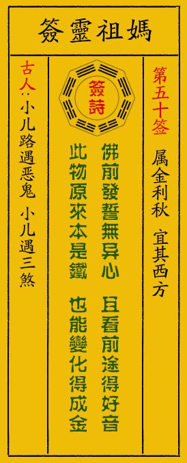 诗曰 | 佛前发誓无异心、且看前途得好音、此物原来本是铁、也能变化得成金。 |