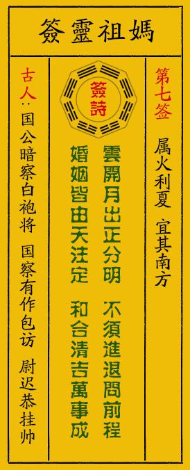 诗曰 | 云开月出正分明、不须进退问前程、婚姻皆由天注定、和合清吉万事成。 |