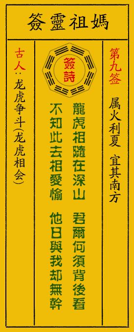 古人 | 【属火利夏宜南方】【龙虎争斗】龙虎的天性本来就是互相敌对,命运却安排一起住在深山里,劝你只求当下惜缘。其余求神明化解,不须探究现在与未来。因为这种命运安排,本就是一种错误的决定,只恐他日,会变成你我各不相干的局面。 |